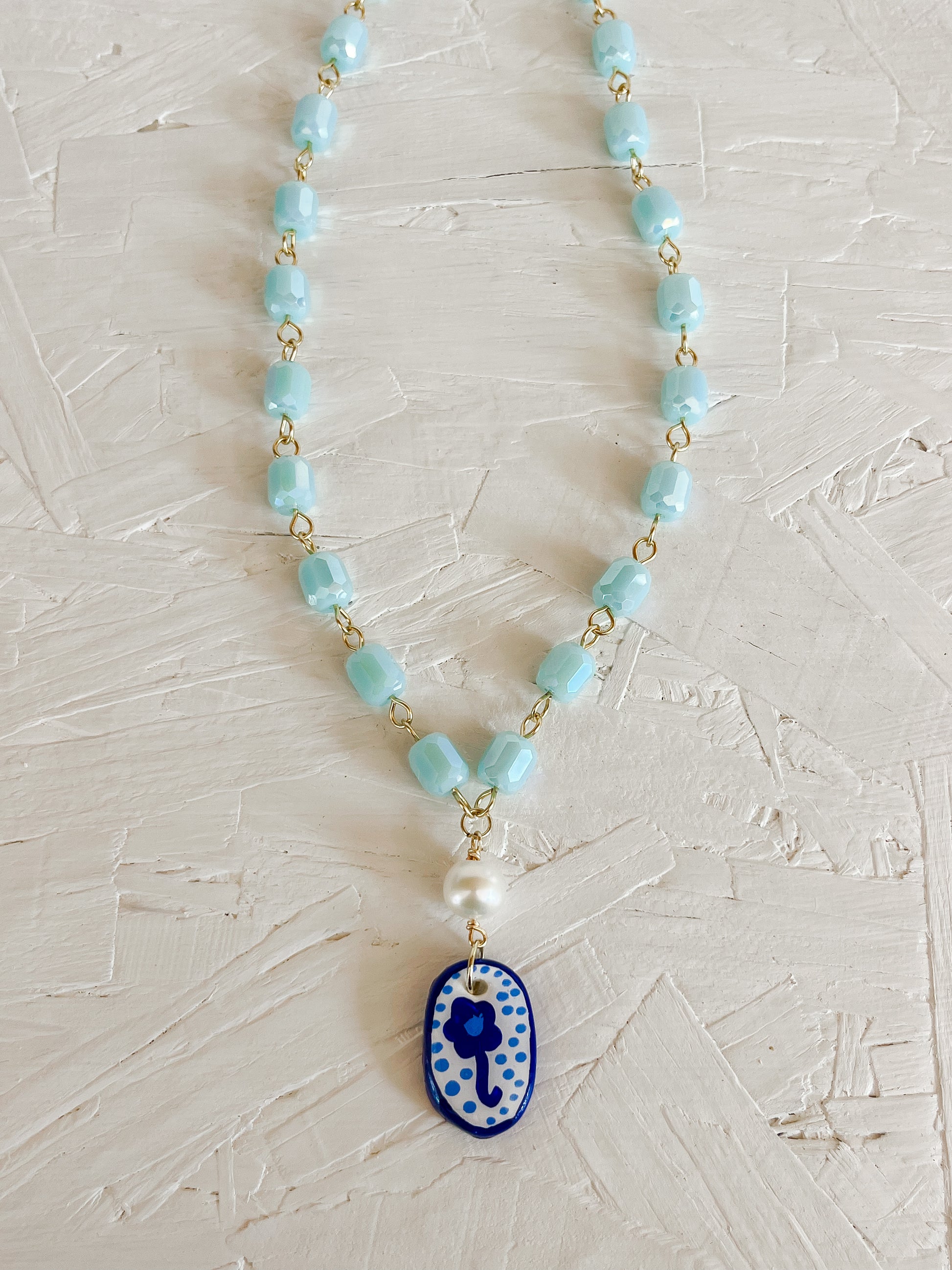 The flower charm is handmade out of clay, hand painted, and then cured with resin. Hanging on a 20”iridescent blue beaded chain with a 2” extender chain