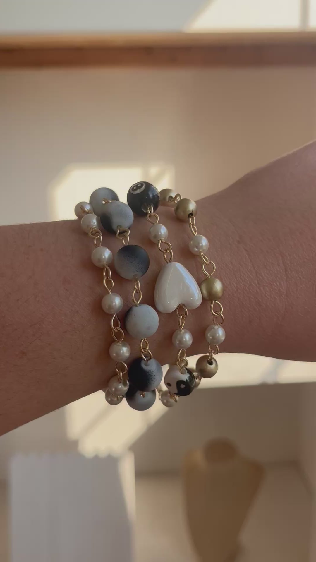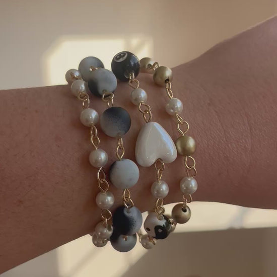 This set is made out of a mix of black, white, and gold beads. One bracelet features a heart, 8 pool ball, dice, pearl moon, and yin yang beads. All bracelets are 7” long with a 1” extender chain (pictured without the extender) Can be worn together or separately!