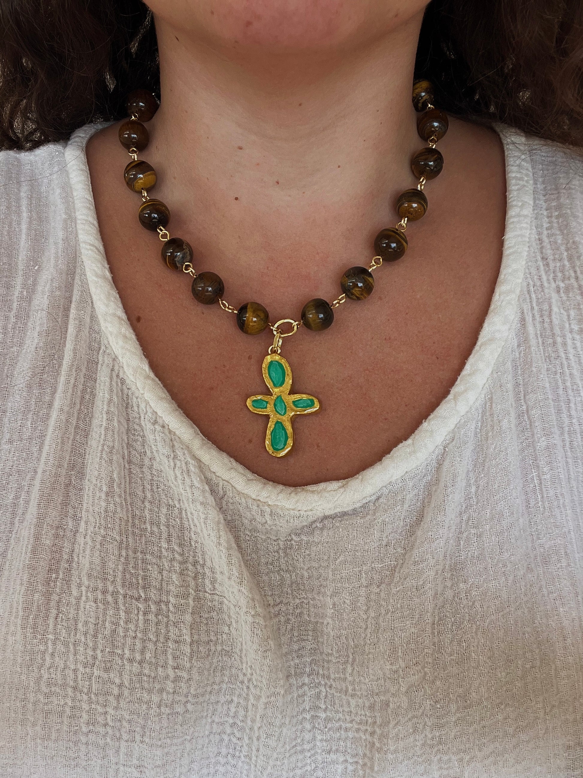 The cross charm is handmade out of clay, hand painted, and then cured with resin. Hanging on a 16” tiger eye chain with a 2” extender chain