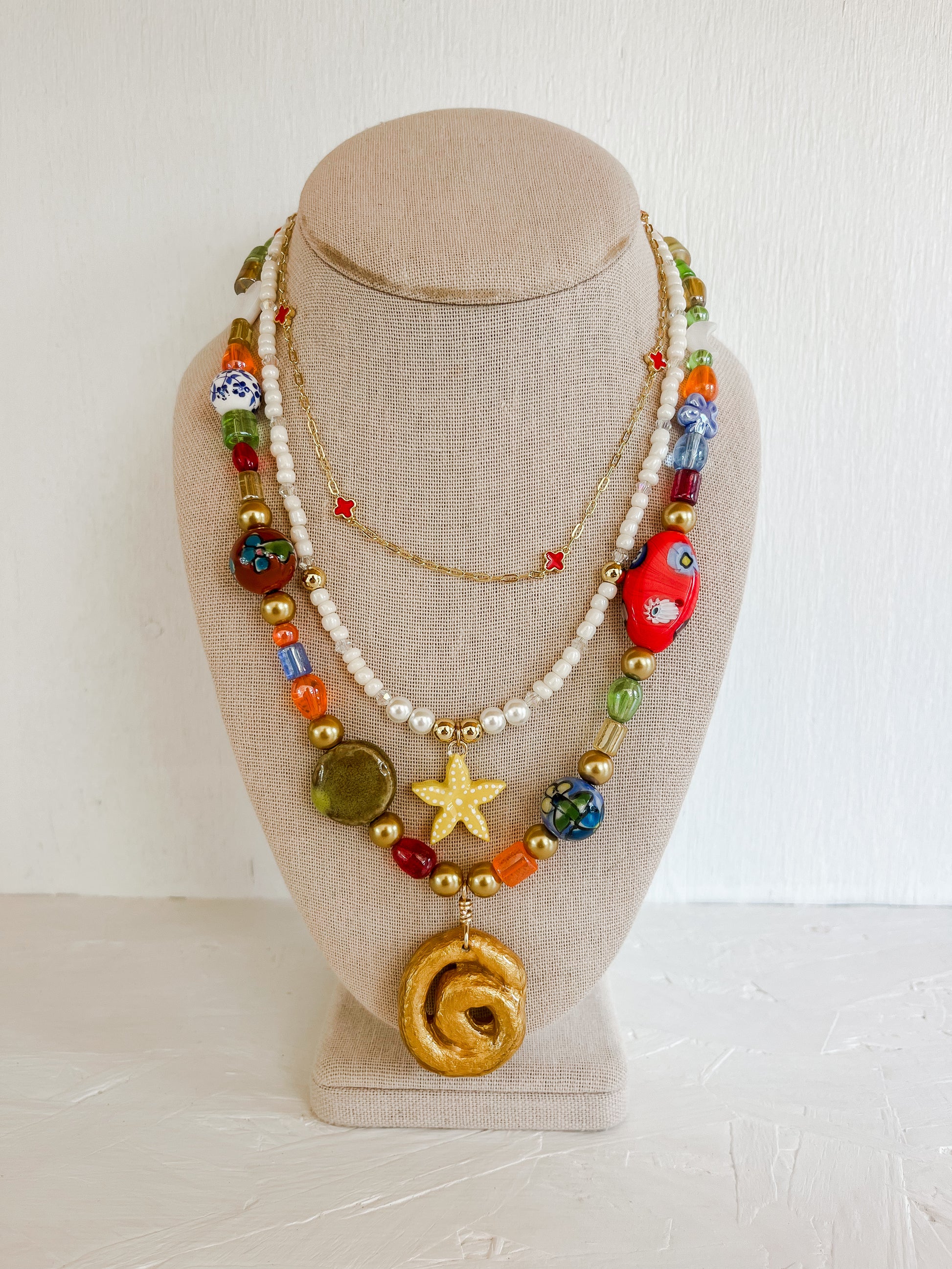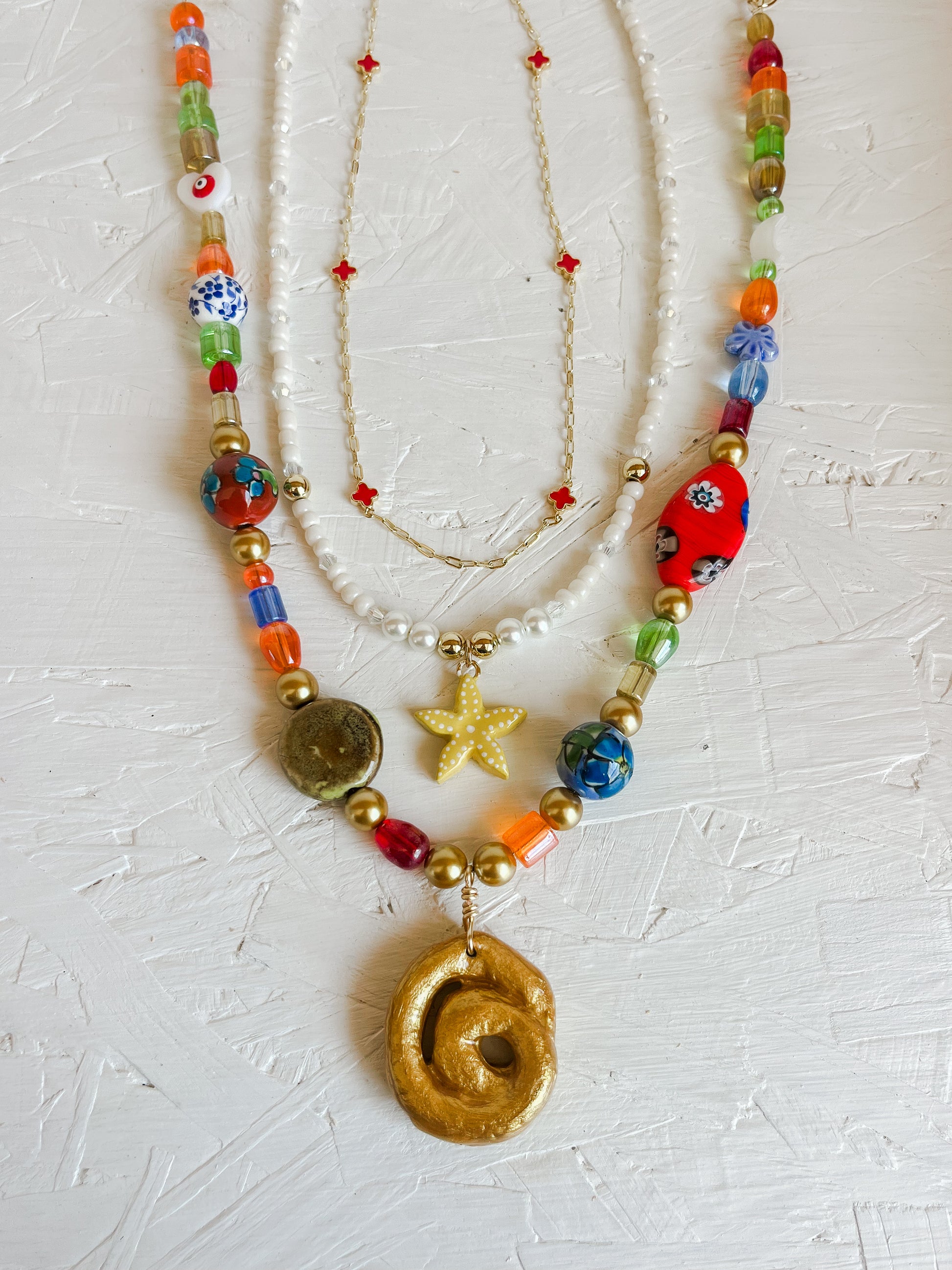 This set consists of 3 necklaces that can be worn together or separately. The yellow flower charm and the gold spiral pendant are handmade out of clay, hand painted, and then cured with resin. A unique, one of a kind set!